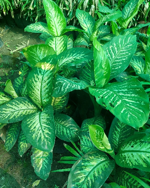 Dieffenbachias feature pointed, ovate leaves in a variety of combinations of green, cream, and white colors. A large, well-grown dieffenbachia can reach 10 feet, with leaves 20 inches long. However, the plants will rarely reach this size in typical indoor conditions, where 3 to 5 feet is more common. Dieffenbachia is a fast-growing plant that can achieve 2 feet in height within a year of planting a rooted cutting, provided it gets enough light.