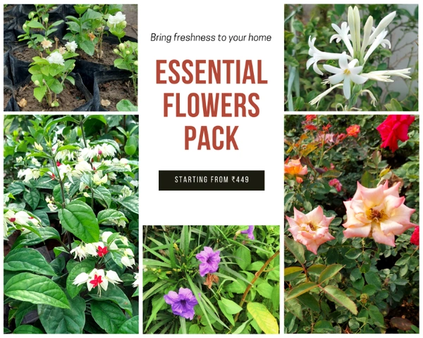 INCLUDED IN THE PACK:- 1 Mogra Plant 1 Bleeding Heart Vine 1 Ruellia Plant 1 Rose Plant (all colors availble) 1 Rajnigandha Plant